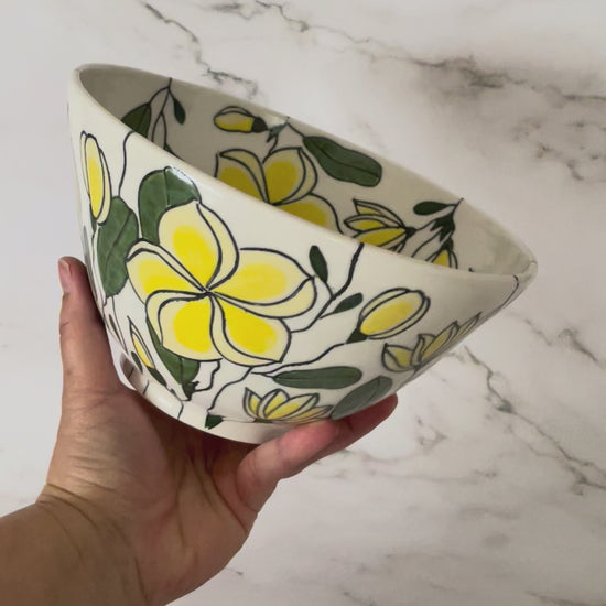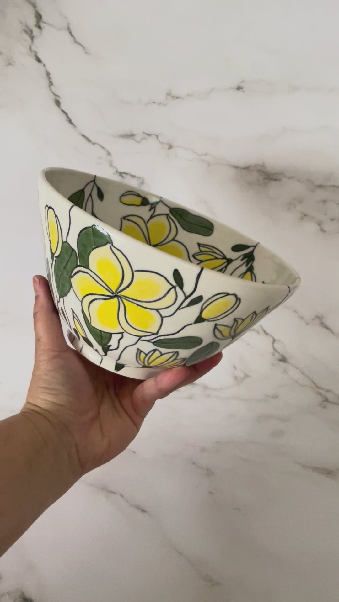 An original, handmade porcelain bowl that was wheel-thrown, and a perfect size for serving dishes at your group gatherings. A whimsical botanical illustration of fragrant yellow frangipani flowers is carved into the surface using a technique that originated in Korea known as mishima, in which I incised the drawing into leather-hard clay and then inlayed a black slip (liquid clay) into the illustrated lines. The flowers and leaves are then hand-painted with underglazes. A clear glossy glaze is applied over the entire piece.