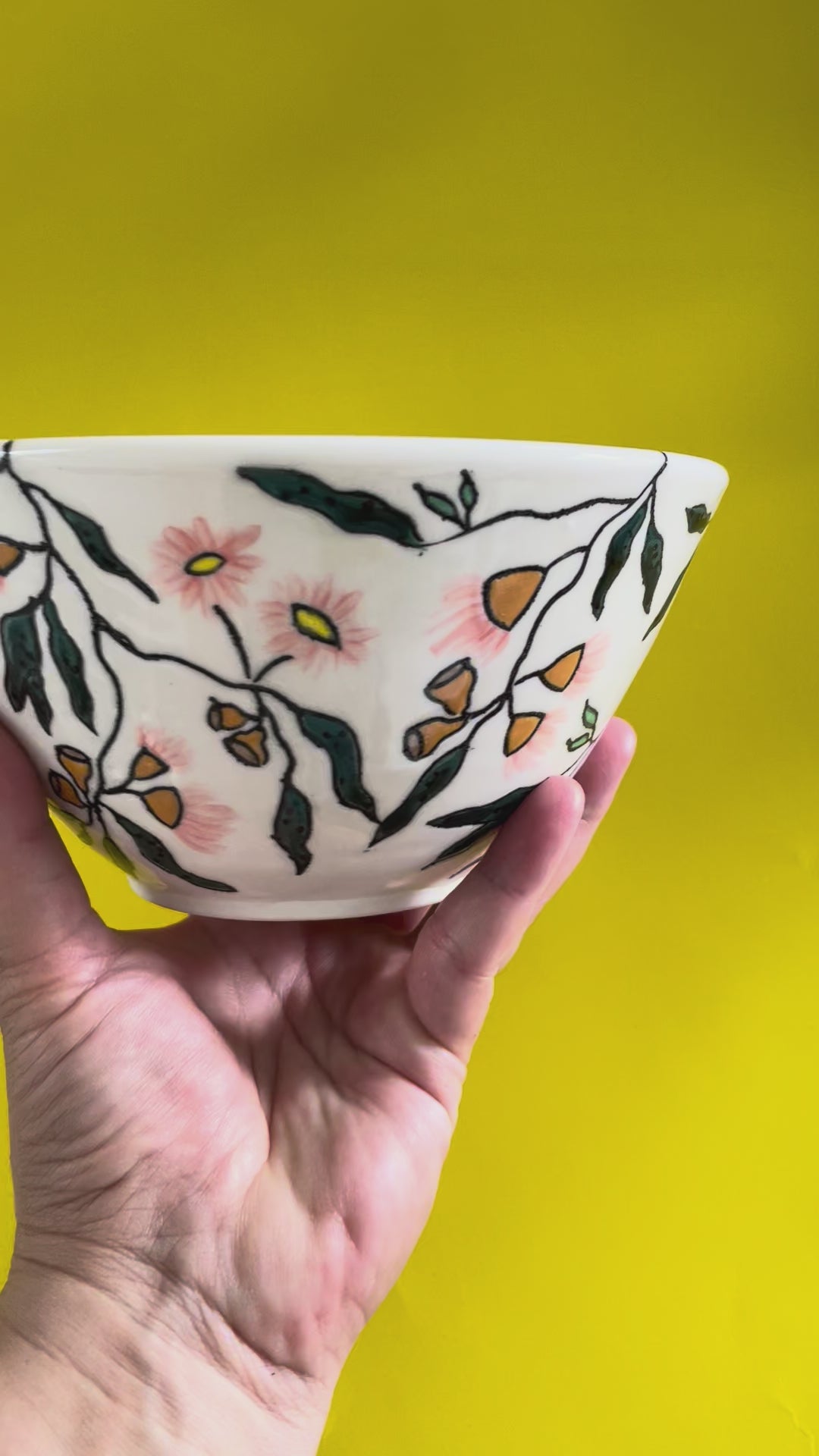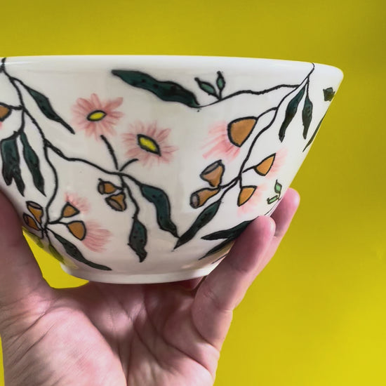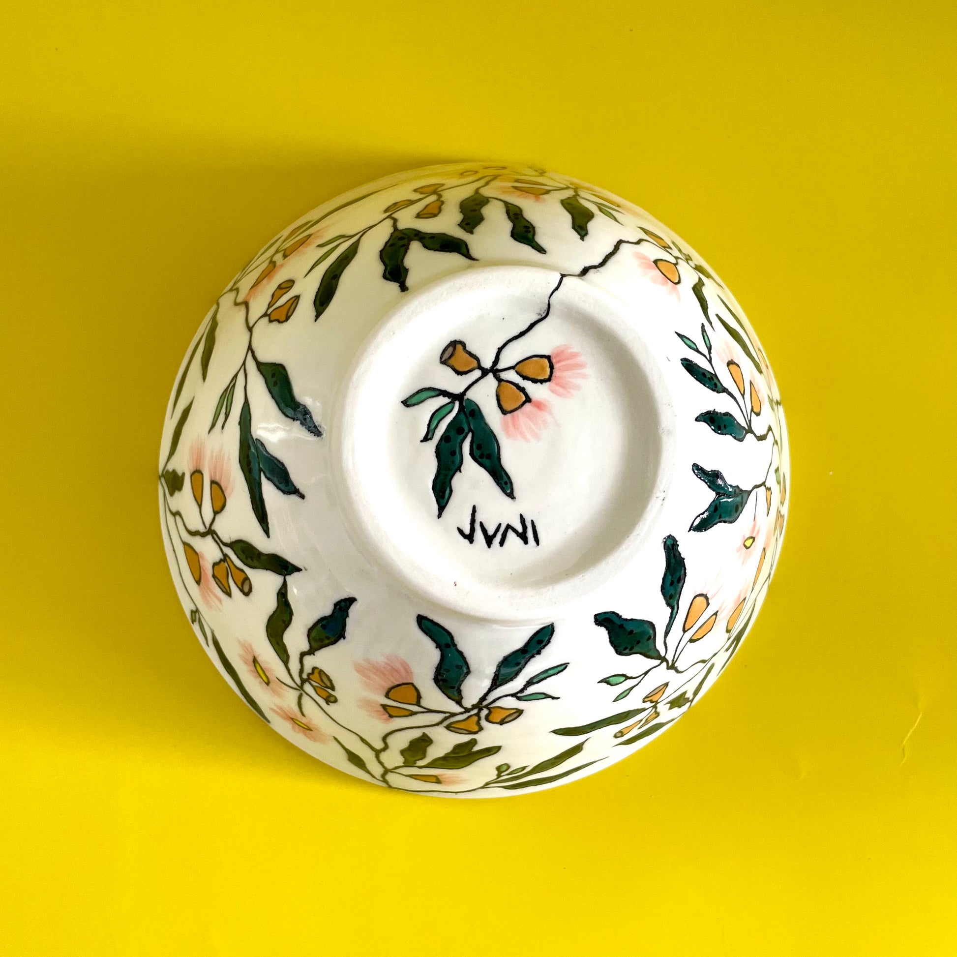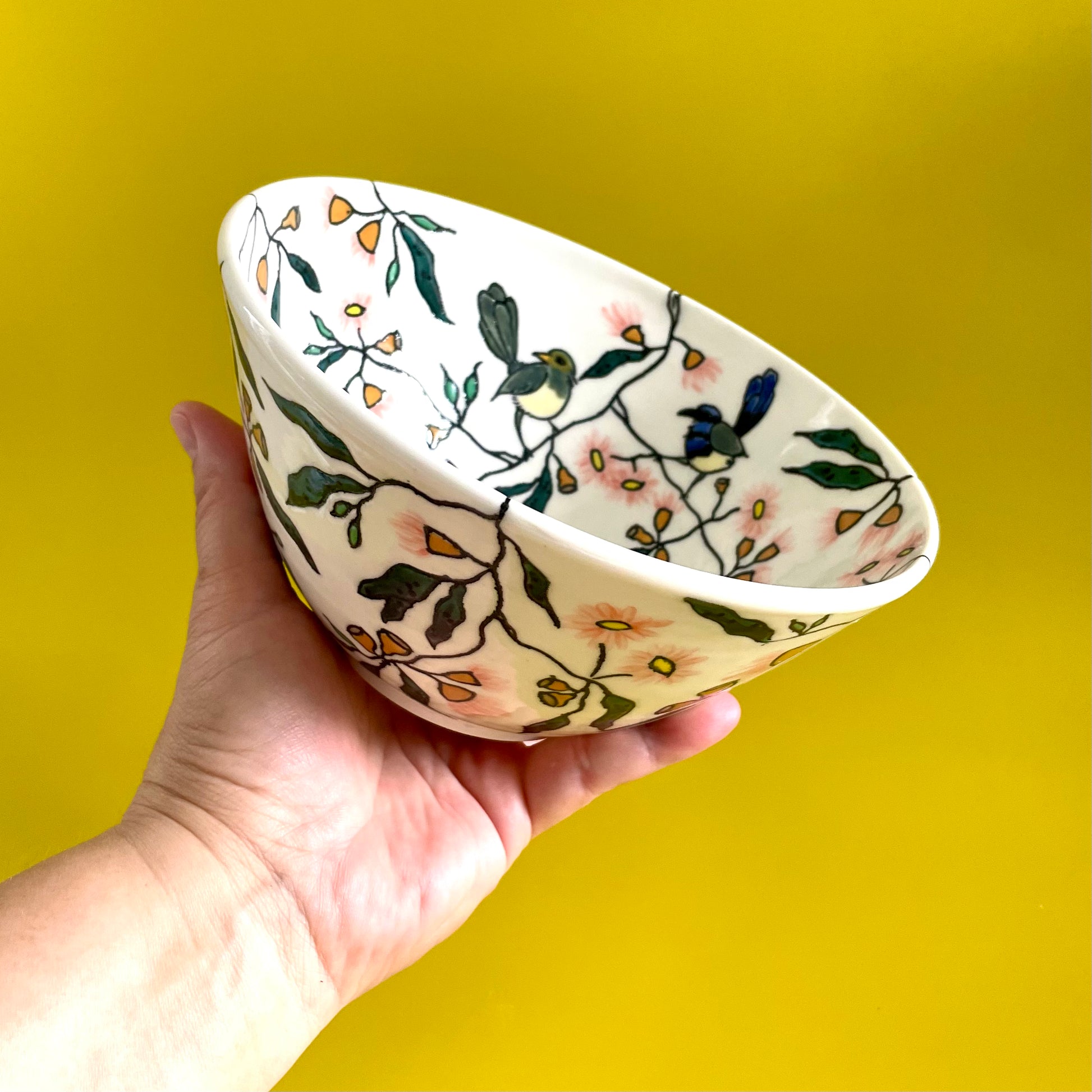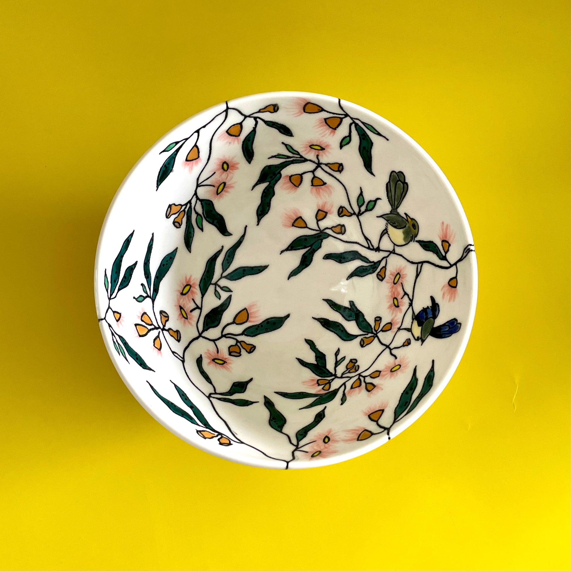 An original, handmade porcelain bowl that was wheel-thrown, and a perfect size for a small or side serve. A whimsical image of a pair of Australian fairy wrens perched in a pink flowering gum tree is carved into the surface using a technique that originated in Korea known as mishima, in which I incised the drawing into leather-hard clay and then inlayed a black slip (liquid clay) into the illustrated lines. The bird details, flowers and leaves are then hand-painted with underglazes. A clear glossy glaze is applied over the entire piece.