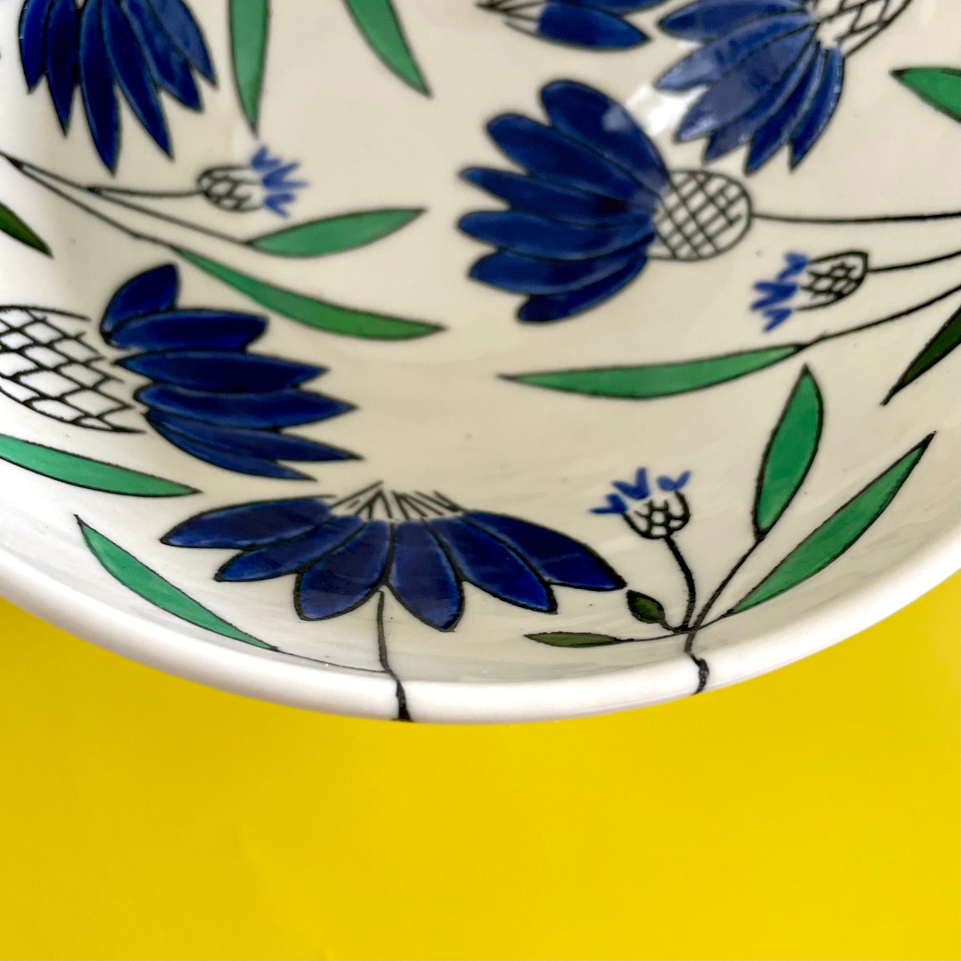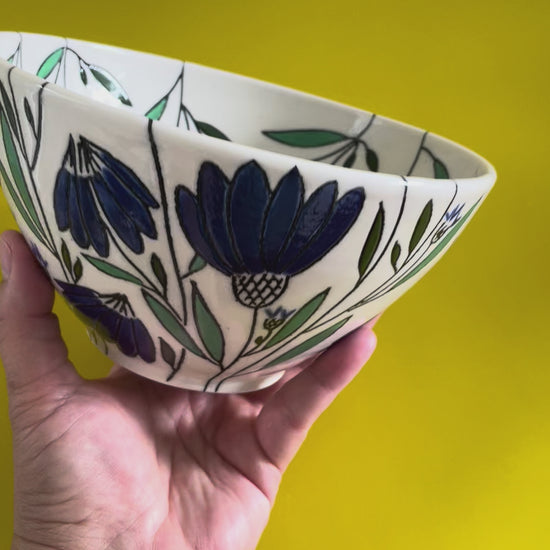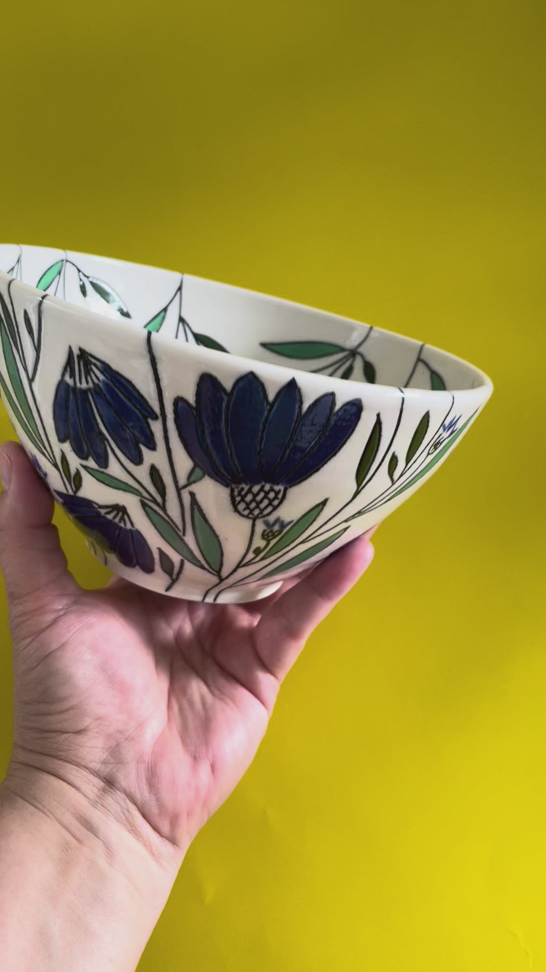An original, handmade porcelain bowl that was wheel-thrown, and a perfect size for a small or side serve. A whimsical image of a field of blue coneflowers is carved into the surface using a technique that originated in Korea known as mishima, in which I incised the drawing into leather-hard clay and then inlayed a black slip (liquid clay) into the illustrated lines. The flowers and leaves are then hand-painted with underglazes. A clear glossy glaze is applied over the entire piece.