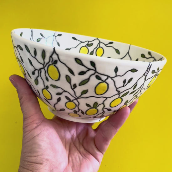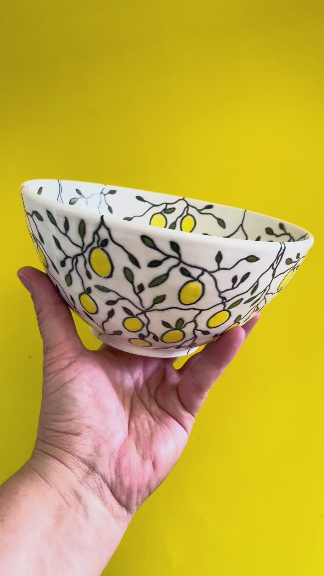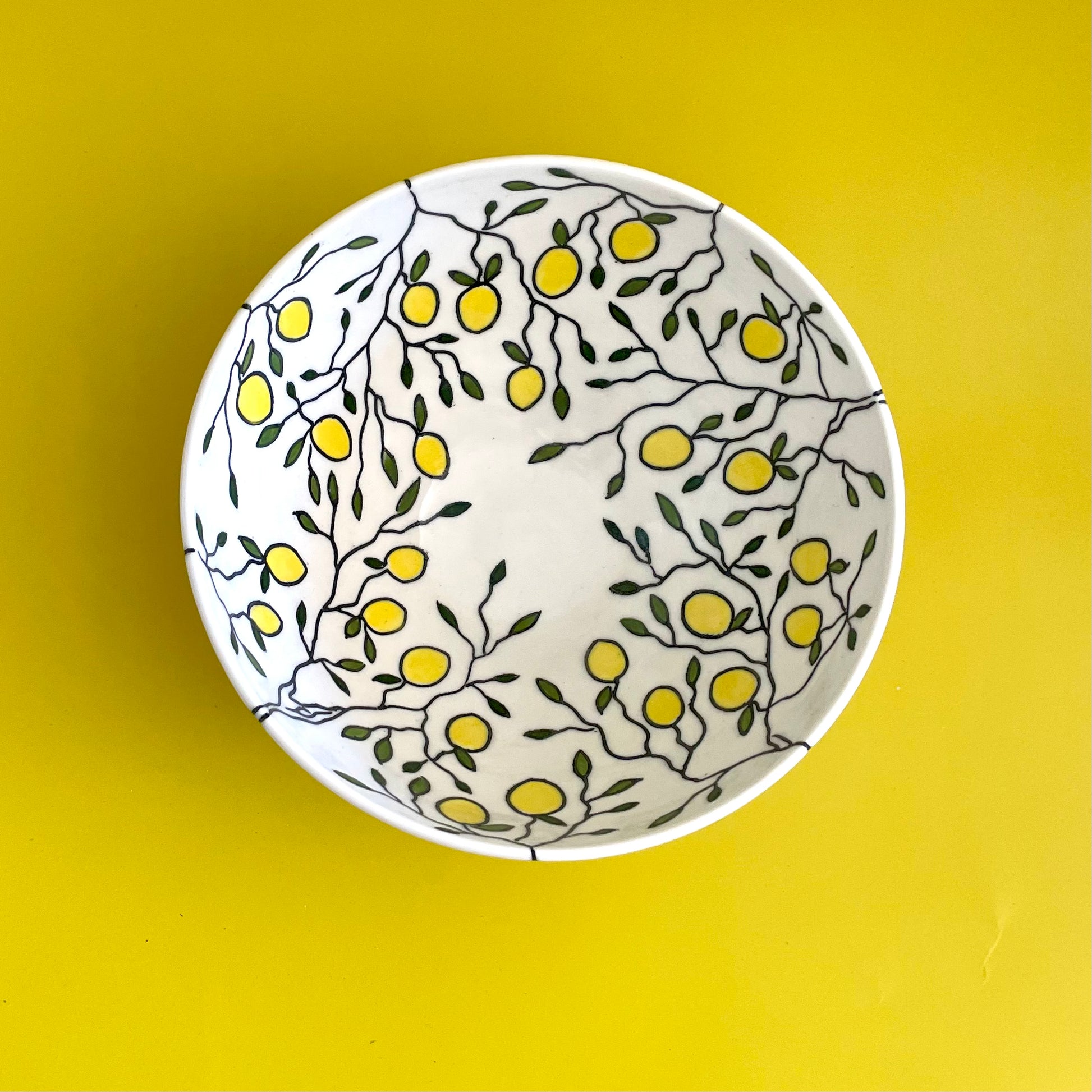 An original, handmade porcelain bowl that was wheel-thrown, and a perfect size for a single serving, or a shared dish for 2-3. A whimsical image of a lemon tree is carved into the surface using a technique that originated in Korea known as mishima, in which I incised the drawing into leather-hard clay and then inlayed a black slip (liquid clay) into the illustrated lines. The fruits and leaves are then hand-painted with underglazes. A clear glossy glaze is applied over the entire piece.
