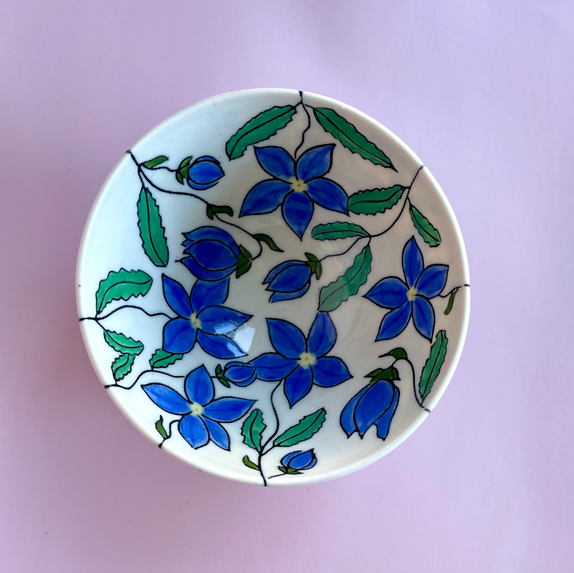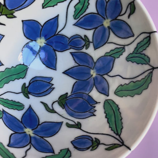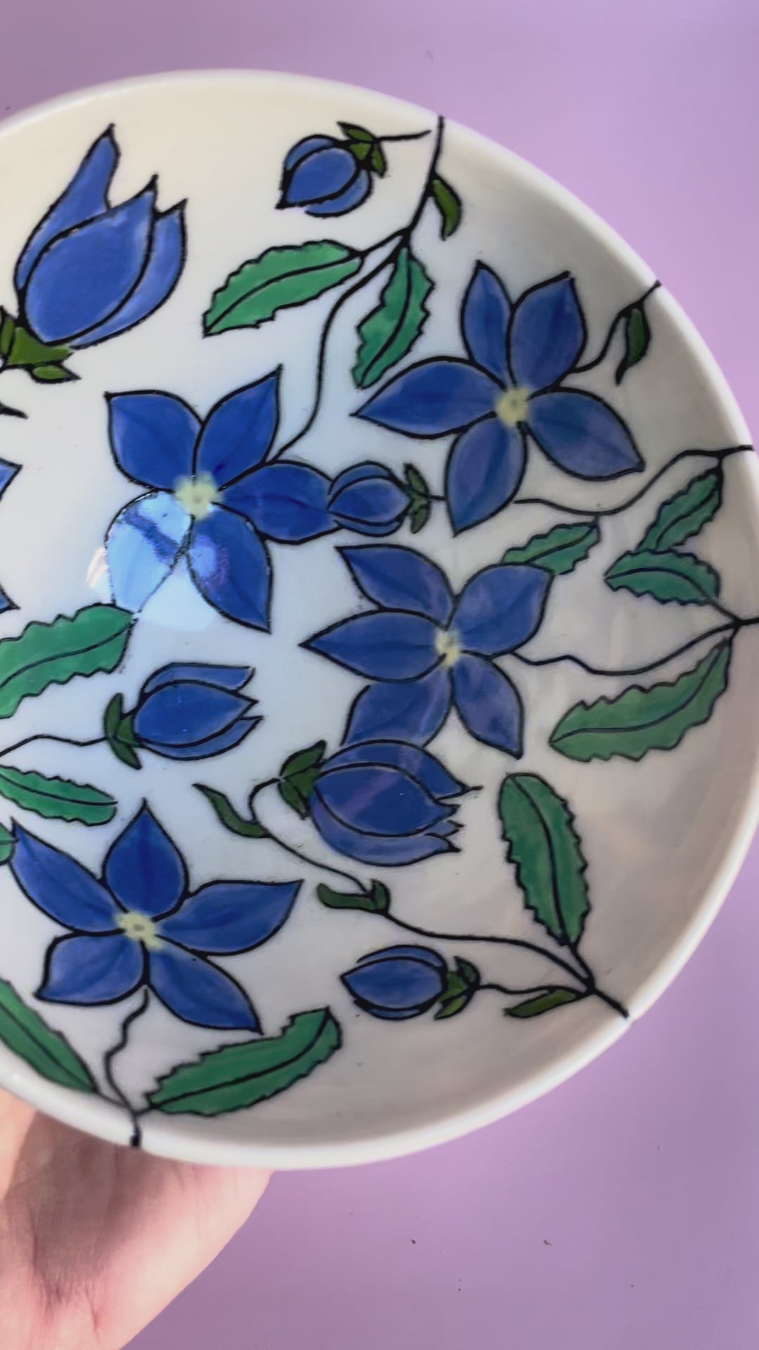 An original, handmade porcelain bowl that was wheel-thrown, and a perfect size for a small or side serve. A whimsical image of the native Australian royal bluebell flower is carved into the surface using a technique that originated in Korea known as mishima, in which I incised the drawing into leather-hard clay and then inlayed a black slip (liquid clay) into the illustrated lines. The flowers and leaves are then hand-painted with underglazes. A clear glossy glaze is applied over the entire piece.