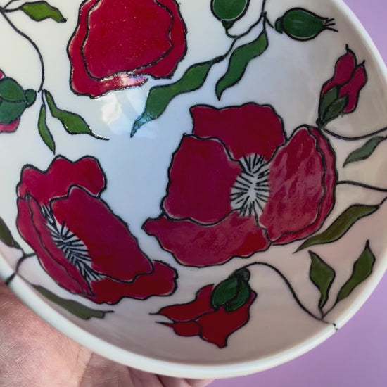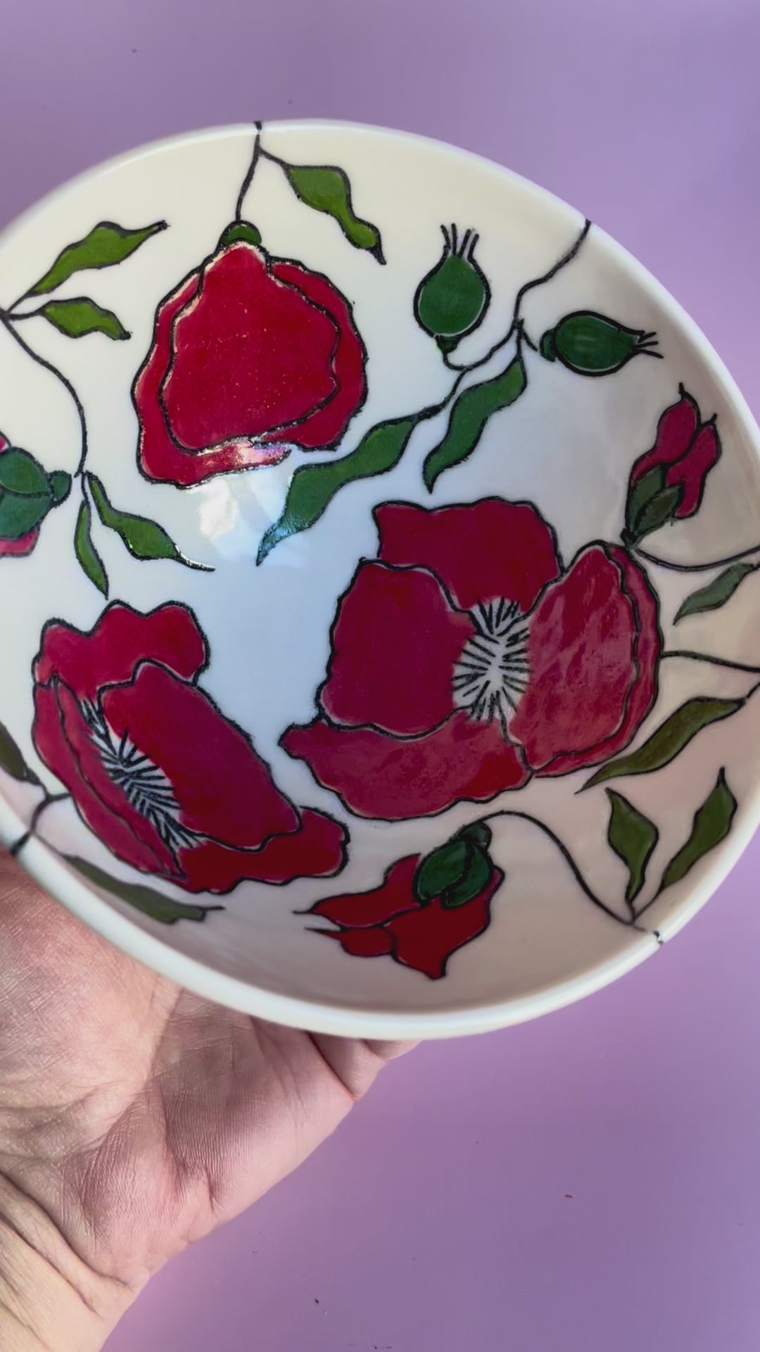 An original, handmade porcelain bowl that was wheel-thrown, and a perfect size for a small or side serve. A whimsical image of the red poppies is carved into the surface using a technique that originated in Korea known as mishima, in which I incised the drawing into leather-hard clay and then inlayed a black slip (liquid clay) into the illustrated lines. The flowers and leaves are then hand-painted with underglazes. A clear glossy glaze is applied over the entire piece.