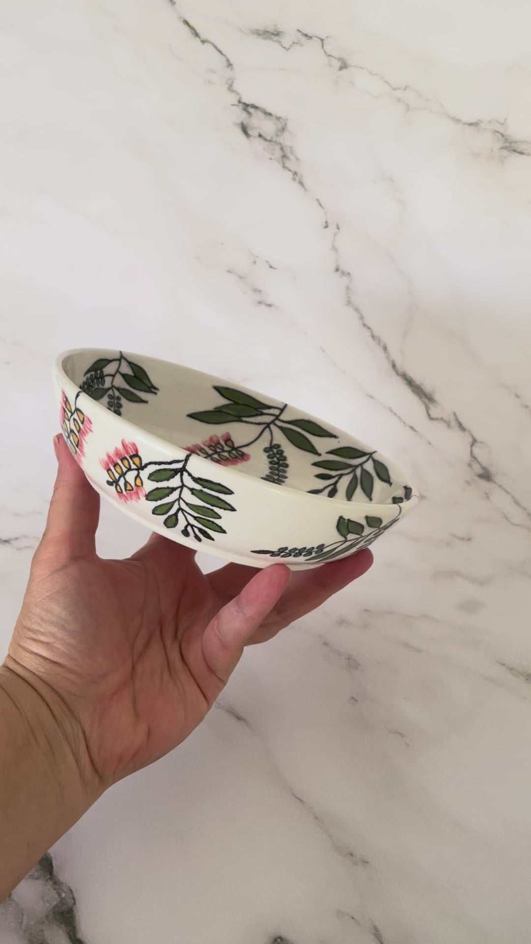 An original, handmade porcelain bowl that was wheel-thrown, and a perfect size for a small or side serve. A whimsical image of native Australian red bottlebrush flowers is carved into the surface using a technique that originated in Korea known as mishima, in which I incised the drawing into leather-hard clay and then inlayed a black slip (liquid clay) into the illustrated lines. The flowers and leaves are then hand-painted with underglazes. A clear glossy glaze is applied over the entire piece.