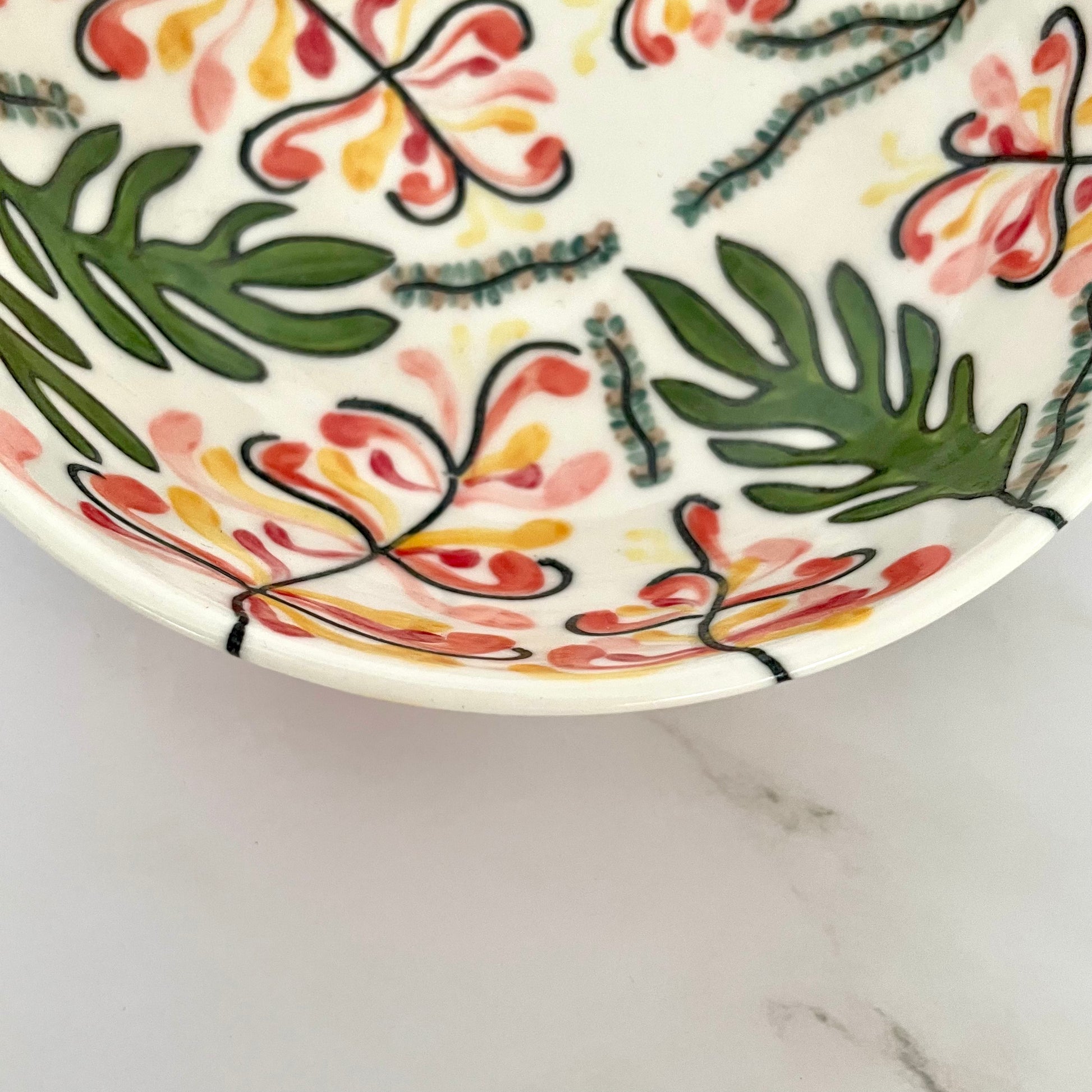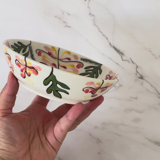 An original, handmade porcelain bowl that was wheel-thrown, and a perfect size for a small or side serve. A whimsical image of native Australian pink grevilleas is carved into the surface using a technique that originated in Korea known as mishima, in which I incised the drawing into leather-hard clay and then inlayed a black slip (liquid clay) into the illustrated lines. The flowers and leaves are then hand-painted with underglazes. A clear glossy glaze is applied over the entire piece.
