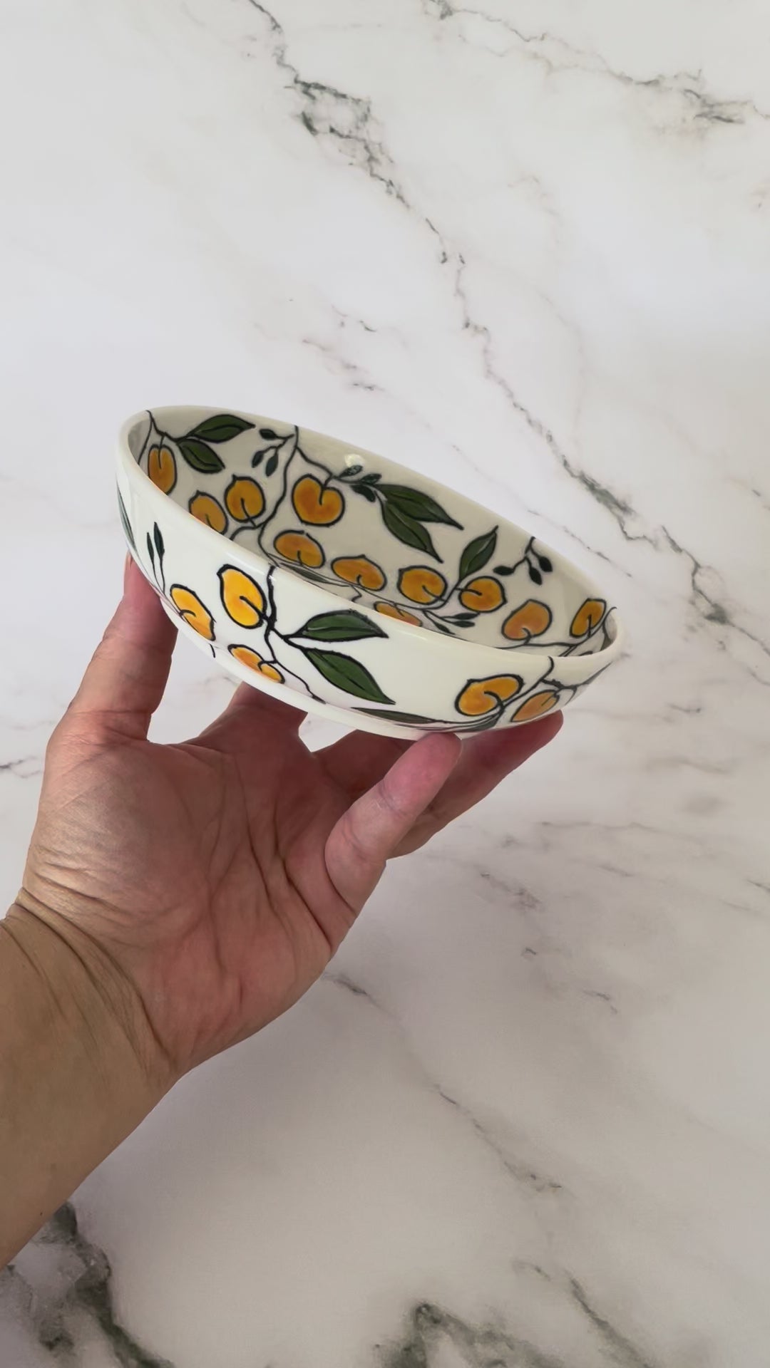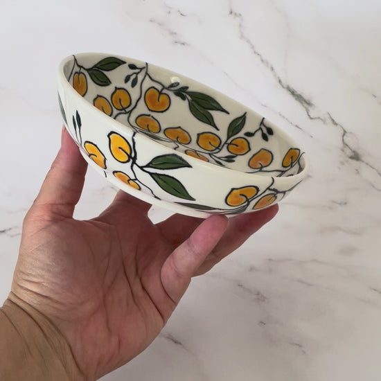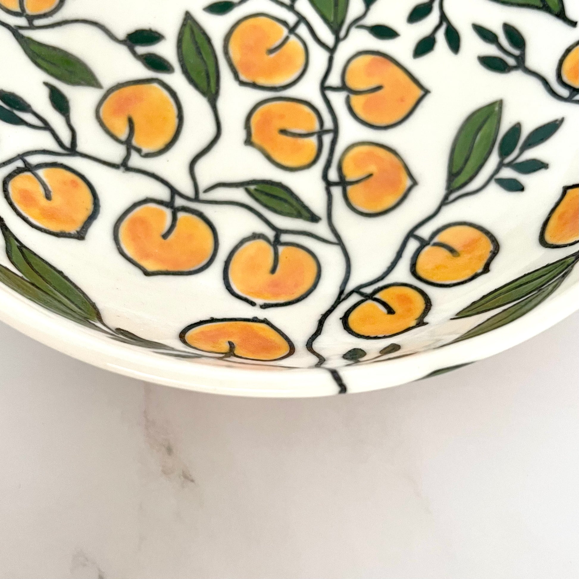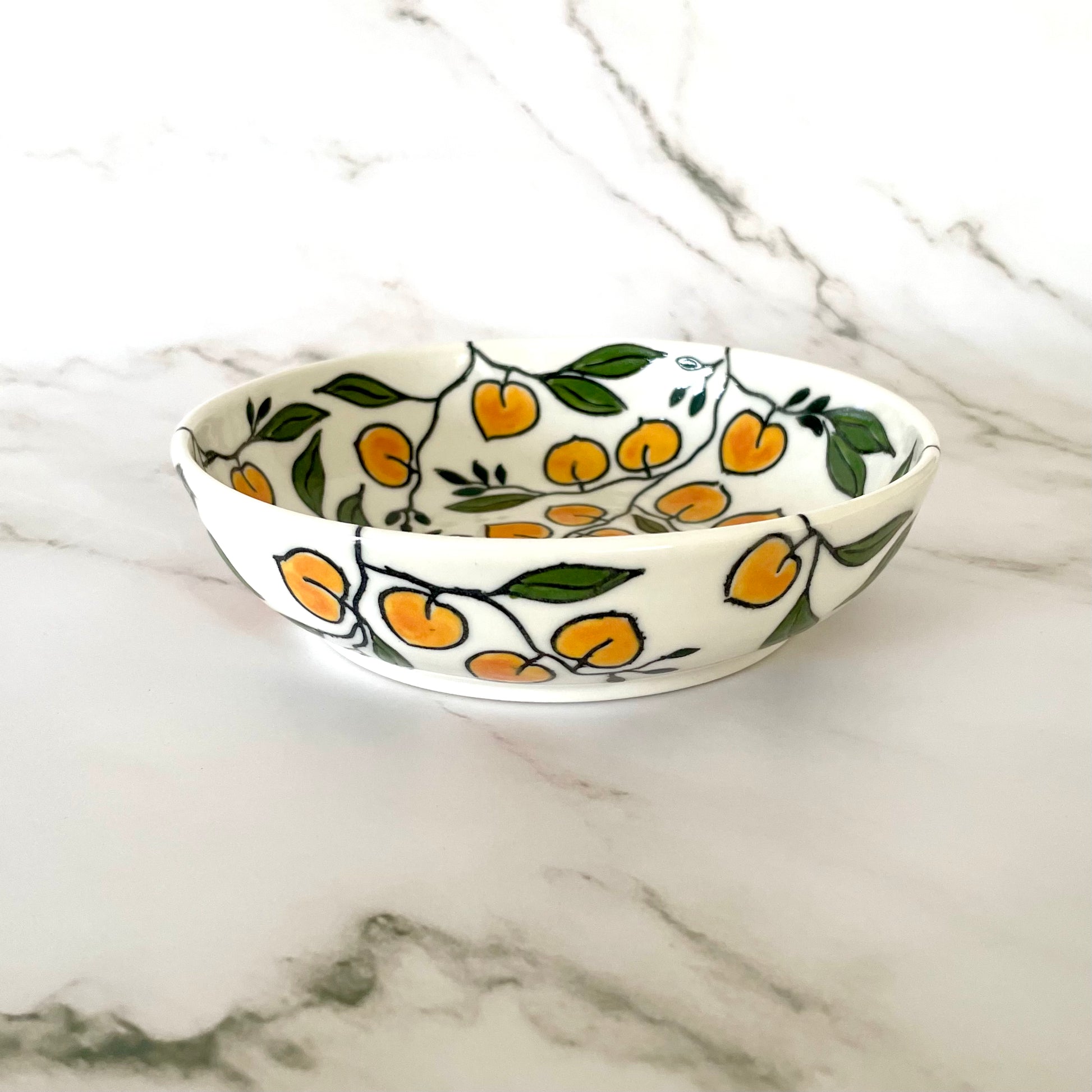 An original, handmade porcelain bowl that was wheel-thrown, and a perfect size for a small or side serve. A whimsical image of peaches is carved into the surface using a technique that originated in Korea known as mishima, in which I incised the drawing into leather-hard clay and then inlayed a black slip (liquid clay) into the illustrated lines. The fruit and leaves are then hand-painted with underglazes. A clear glossy glaze is applied over the entire piece.